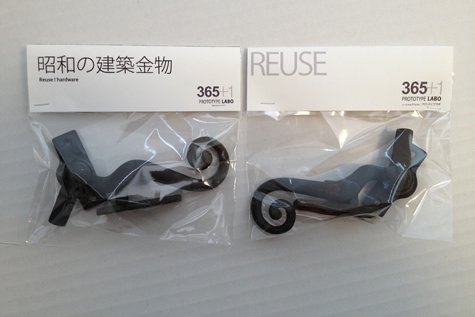 昭和の建築物で屋根を葺くのに使われた玄昌石の天然スレート。その稀少な部材を再利用して伝言板をつくりました(左写真)。昔懐かしい「石筆」で書くと、風合いのあるメッセージボードに。水拭きすれば何度でも書き直しができます。昭和の建築金具(写真右)は建築部材をパッケージ化して販売し、販売収益の使い道や販売目的を伝えるメッセージを一緒に伝えていく。いずれも再利用商品を考え、NPO活動の財源確保の手段を提案していく「仕組みづくり」を提案。
