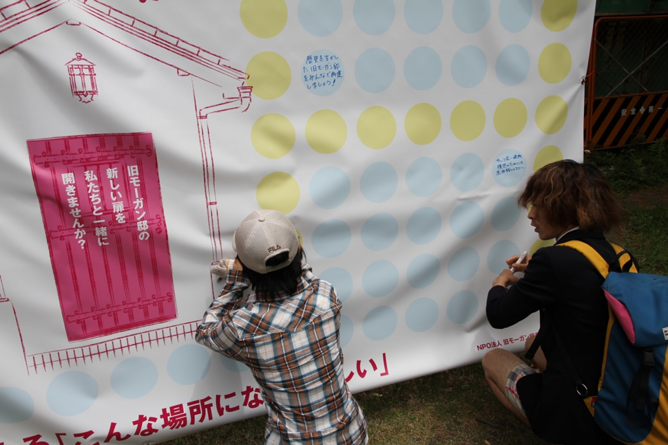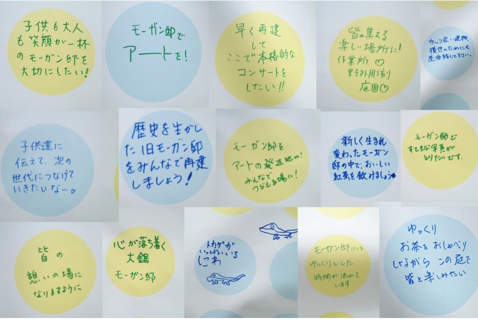 横断幕にメッセージを残そう。1枚の横断幕の円に書きこめる数は122メッセージ。それぞれ緑と青のマジックで書き分けると、MHのロゴがくっきりと浮かび上がります。デザイナーが完結する公共広告(サイン)のイメージではなく、訪問者が「こうでありたい」というリアルな言葉を残す事によって完成するフラッグ。火災で消失した建物を更に立入禁止の工事用フェンスが覆う。そんな悲しい姿を跳ね返すのは、緑豊かな庭とその場所を愛する市民の熱意。逆境を乗り切る時にデザインでできるサポートってなんだろう?って考えた結果、こんな元気づけのツールがまず浮かんだのです。複数のメッセージ横断幕がクリストの包囲アートのようにモーガン邸を包む。緑の庭園にとけ込む2色の水玉模様を想像すると、もっともっと「よっしゃー」っていう気持ちになれそうです。